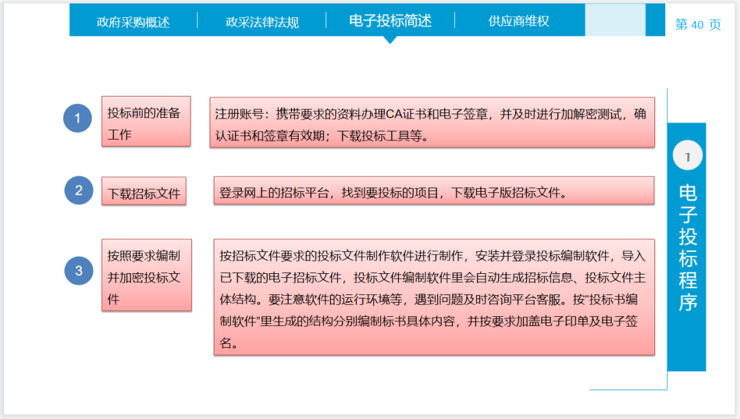 而随着信息化的发展,招投标形式也随之变化,相对于传统投标更加便捷的电子投标进入我们的视野。那么如果进行电子投标,要怎么操作呢?老师也是对准备工作和注意事项进行了阐述。
